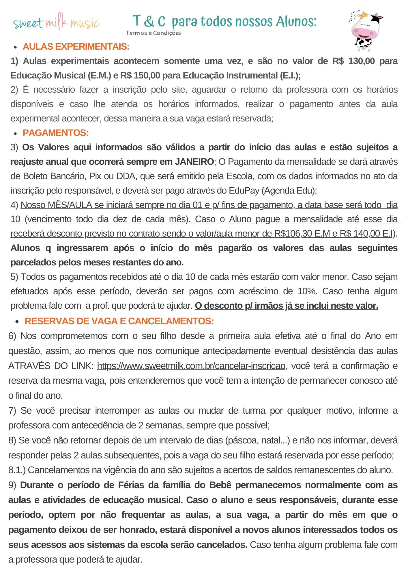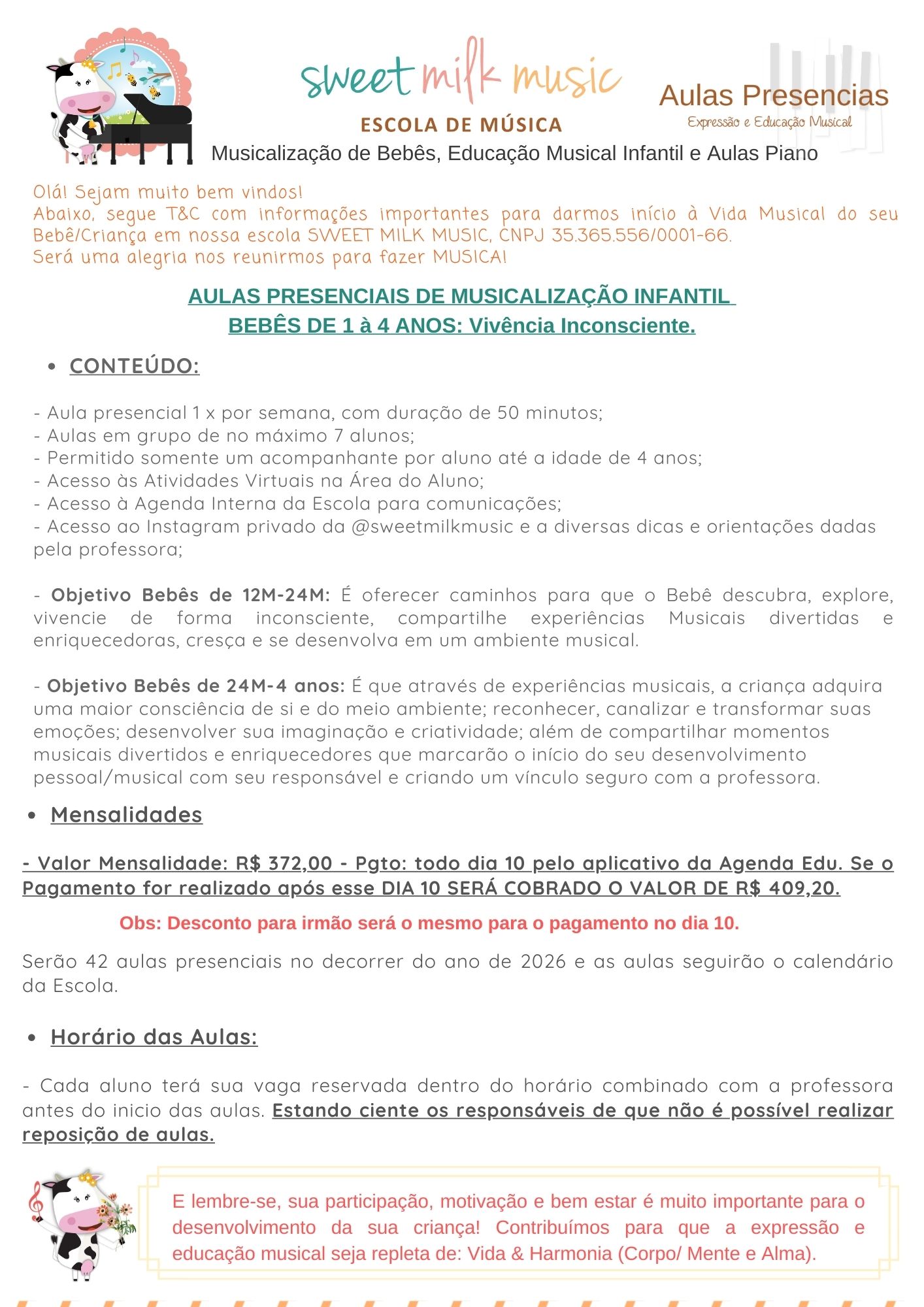 Abaixo, segue FORMULÁRIO de INSCRIÇÃO e T&C com informações importantes para darmos início à Vida Musical do seu Bebê/Criança aqui na SWEET MILK MUSIC, CNPJ 35.365.556/0001-66.